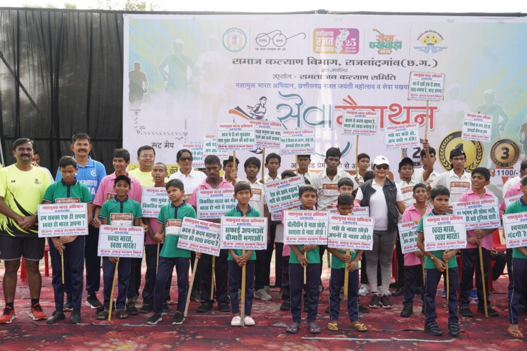 राजनांदगांव छत्तीसगढ़ रजत महोत्सव, सेवा पखवाड़ा एवं नशामुक्त भारत अभियान के तहत समाज कल्याण विभाग द्वारा समता जन कल्याण समिति के सहयोग से अंतर्राष्ट्रीय एस्टोटर्फ हॉकी स्टेडियम राजनांदगांव में सेवा मैराथन दौड़ का आयोजन किया गया। महापौर श्री मधुसूदन यादव द्वारा सेवा मैराथन दौड़ को हरी झंडी दिखाकर शुभारंभ किया गया। सेवा मैराथन अंतर्राष्ट्रीय एस्टोटर्फ हॉकी स्टेडियम से प्रारम्भ होकर कमला कॉलेज रोड – महाराणा प्रताप चौक – दीपिका विद्या मंदिर आरके नगर चौक से वापस अंतर्राष्ट्रीय एस्टोटर्फ हॉकी स्टेडियम में समाप्त हुई।