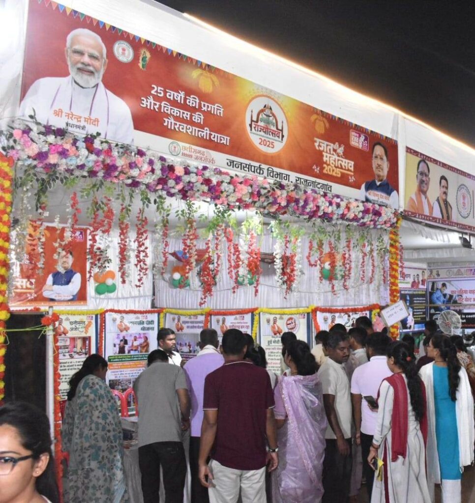 राजनांदगांव । छत्तीसगढ़ राज्य स्थापना के 25 वर्ष पूर्ण होने के अवसर पर सर्वेश्वरदास नगर पालिक निगम उच्चतर माध्यमिक विद्यालय (म्यूनिसिपल स्कूल मैदान) राजनांदगांव में राज्योत्सव 2025 का तीन दिवसीय भव्य आयोजन किया गया। राज्योत्सव के अवसर पर जनसंपर्क विभाग द्वारा 25 वर्षों की प्रगति और विकास की गौरवशाली यात्रा को प्रदर्शित किया गया। जनसंपर्क विभाग के स्टॉल में शासन की लोकहितकारी योजनाओं की जानकारी देने के साथ ही छत्तीसगढ़ जनमन पत्रिका, छत्तीसगढ़ में सुशासन के लिए नवाचार ब्रोसर, विकसित भारत की ओर बढ़ते कदम का नि:शुल्क वितरण किया गया। दूरदराज से आए ग्रामीणों ने जनसंपर्क विभाग की फोटो प्रदर्शनी की सराहना की।